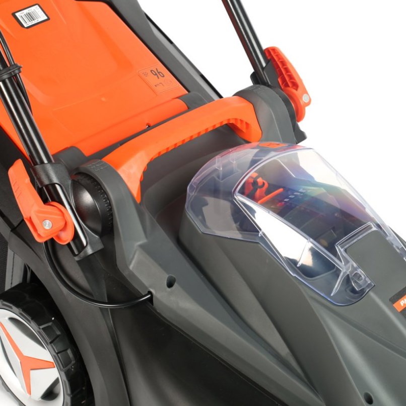 Складная рукоятка, съёмный травосборник и компактный размер позволяют легко транспортировать и хранить газонокосилку.